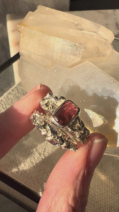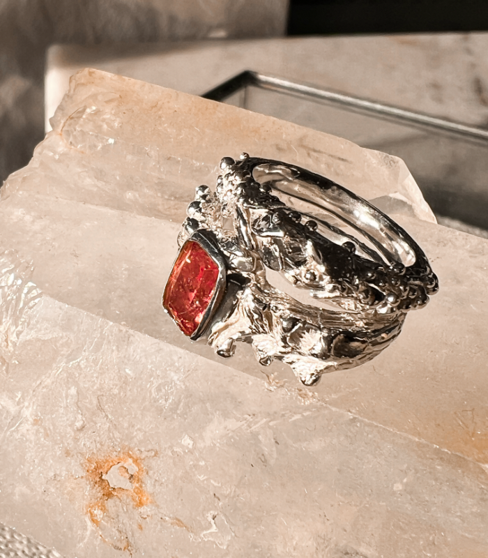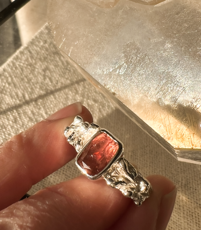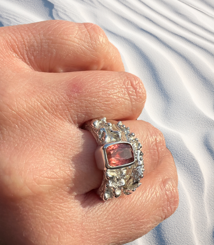 Un diseño único que fusiona la fuerza orgánica de la plata con la delicadeza etérea de una turmalina rosa natural. La gema, con su cálido resplandor y sutiles destellos internos, está engastada a mano en un marco sólido que realza su belleza. La textura escultórica del aro, inspirada en formas orgánicas, convierte a esta pieza en una joya irrepetible y llena de carácter.
