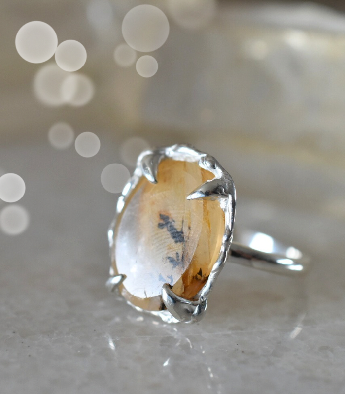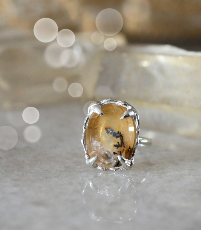 Anillo en plata 950 con cuarzo dendrita natural, una gema reconocida por sus inclusiones orgánicas que forman pequeñas ramas y paisajes minerales dentro de la piedra.