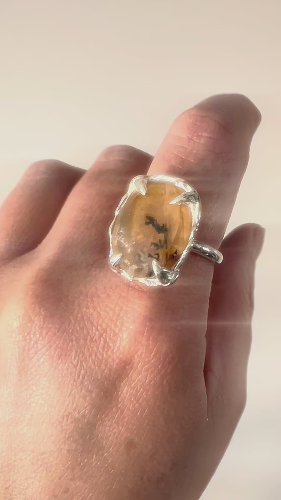 La montura está trabajada a mano con garras orgánicas que acompañan la forma de la gema, permitiendo que cada detalle interno permanezca visible.