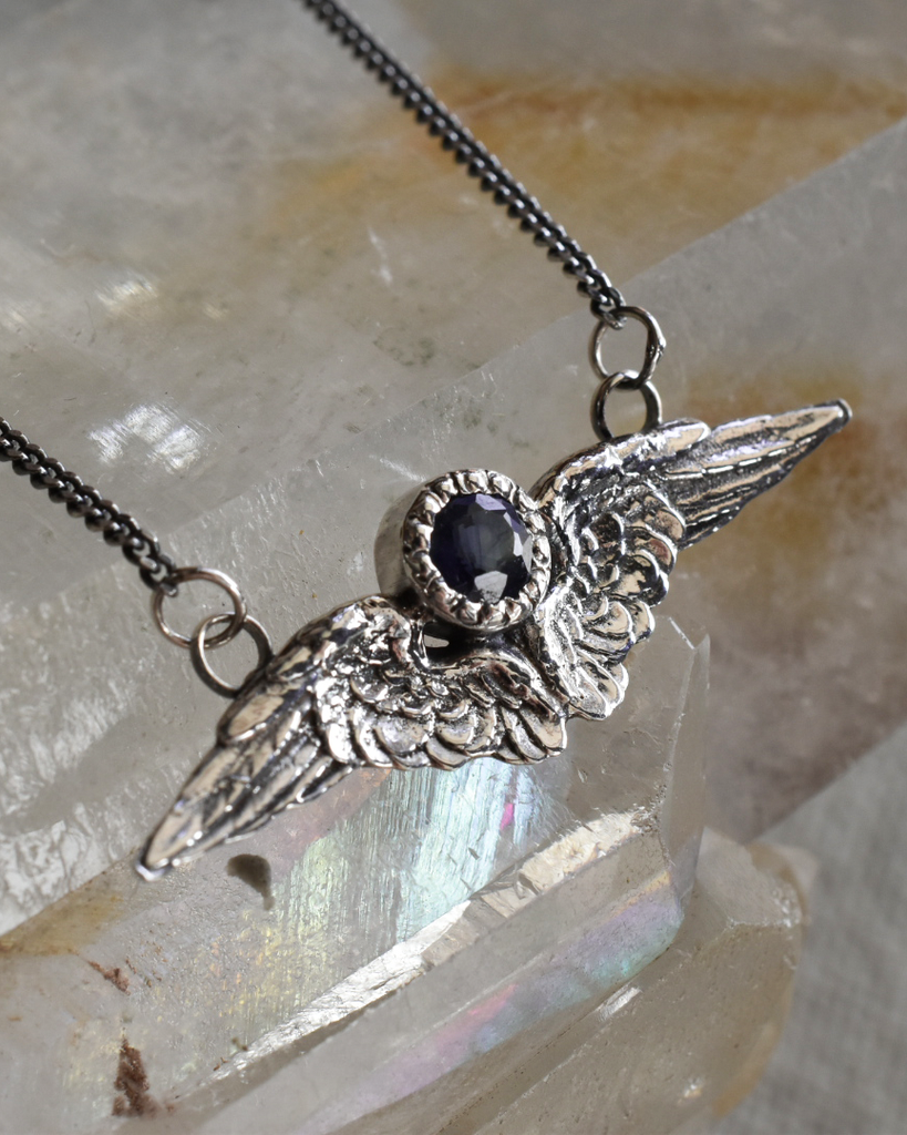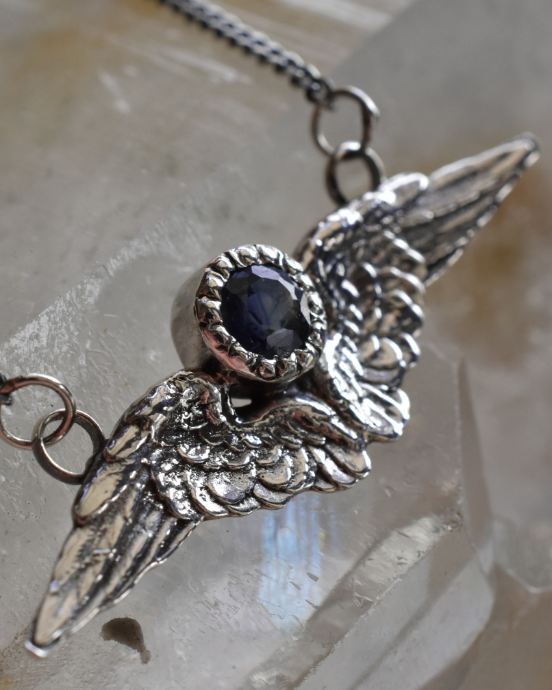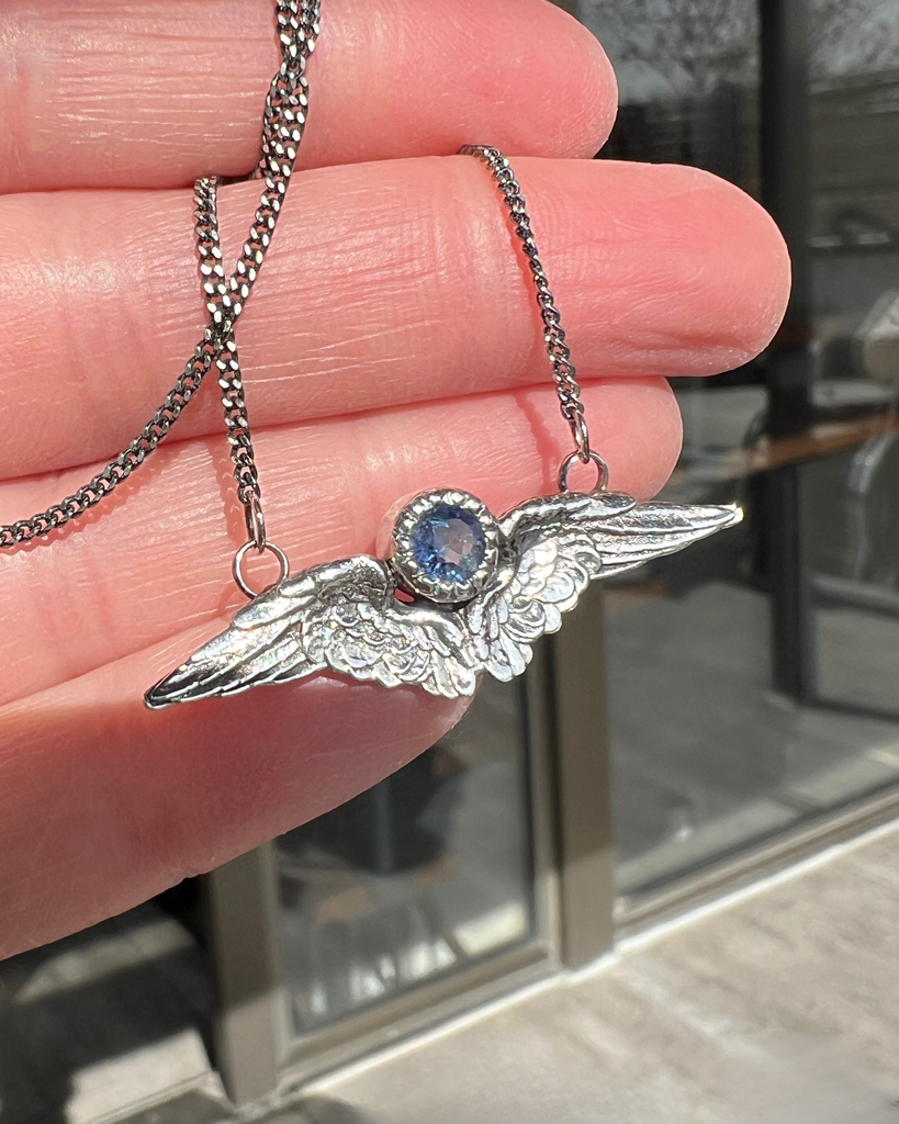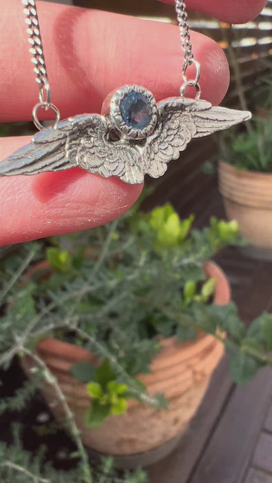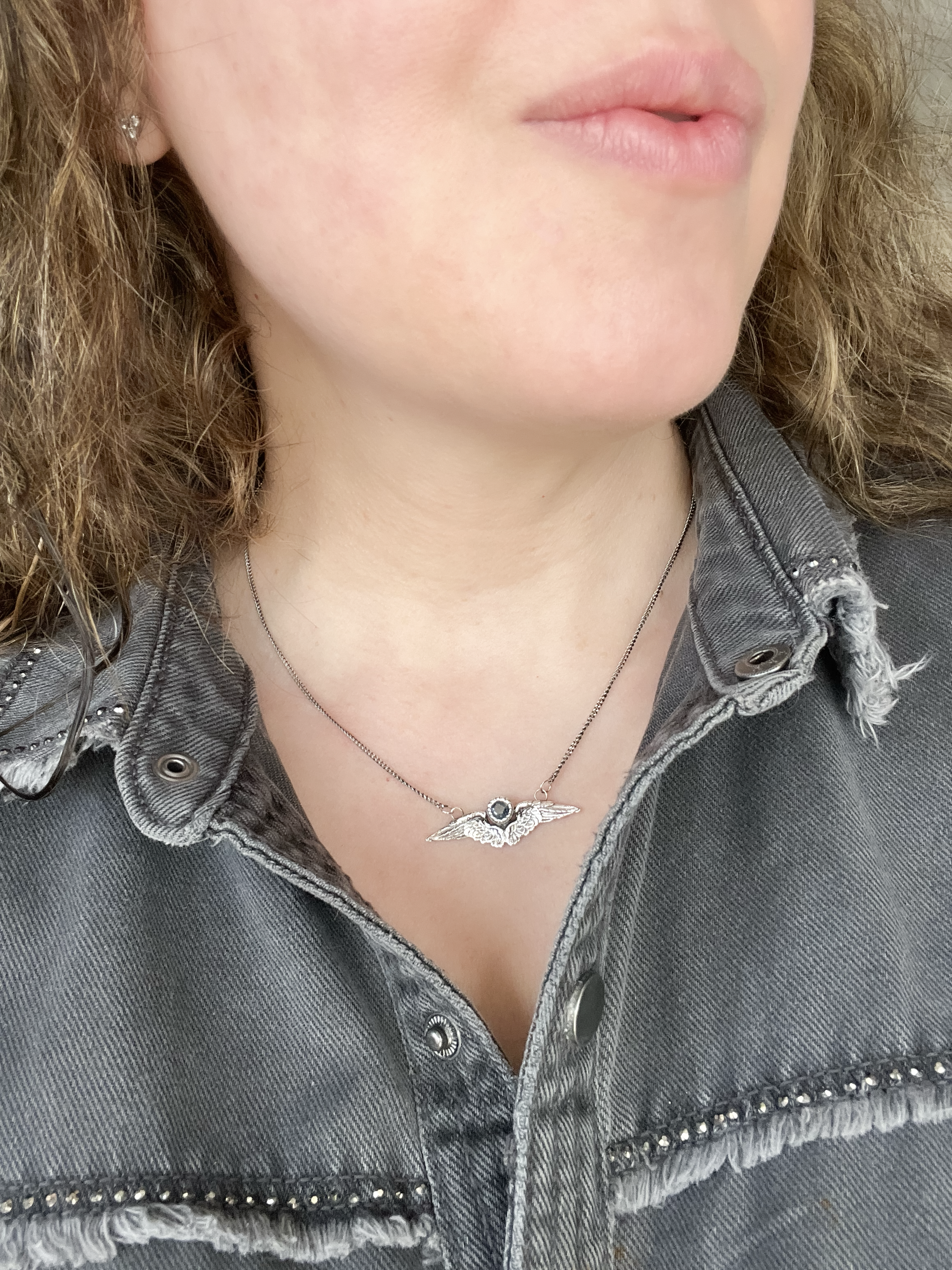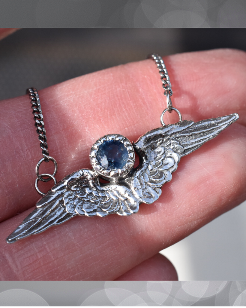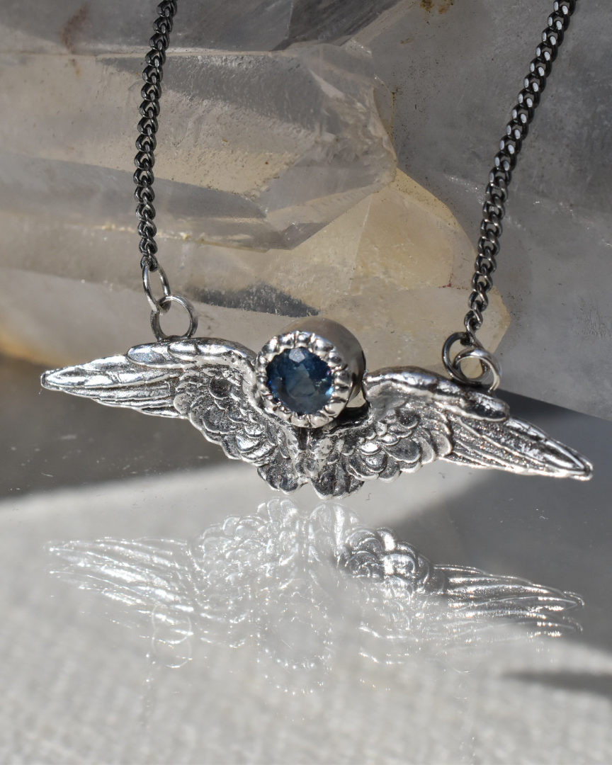 Elegante collar en plata fina con diseño de alas detalladas que evocan libertad y protección. En el centro, una piedra zafiro azul facetada brilla con destellos profundos, aportando un toque celestial y sofisticado. Su cadena delicada complementa a la perfección la pieza central, ideal para quienes buscan un accesorio con significado y estilo.
