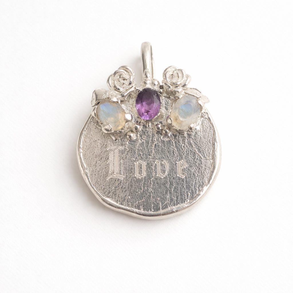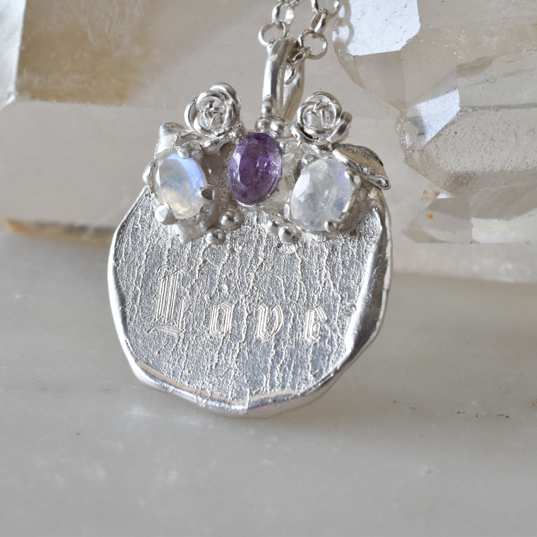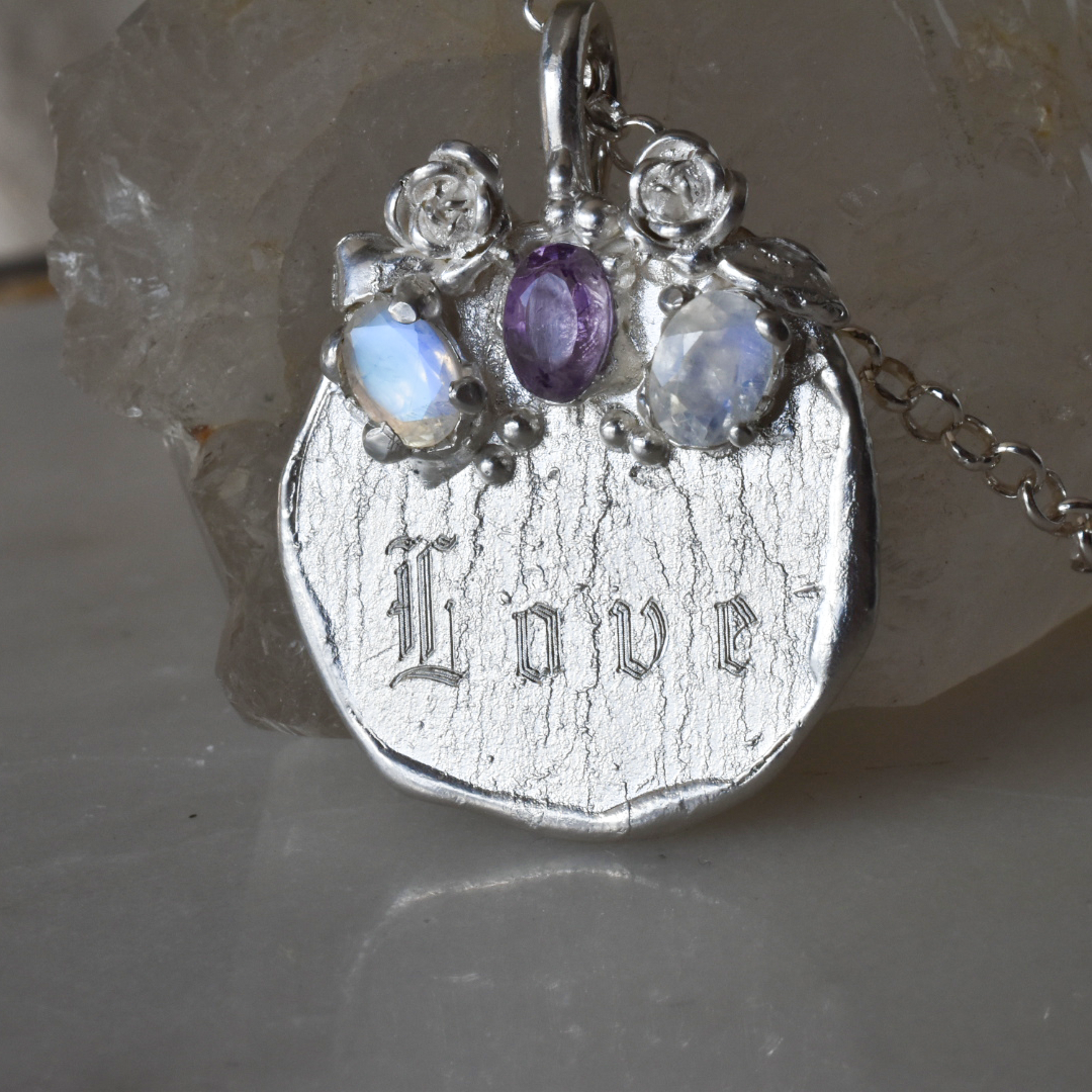 En el centro, “Love” grabado en una tipografía antigua, como si viniera de otro tiempo. Sobre ella, tres piedras que parecen pequeñas luces: una amatista profunda al corazón y dos piedras luna que capturan reflejos suaves, casi etéreos. Juntas, evocan intuición, protección y amor que trasciende.